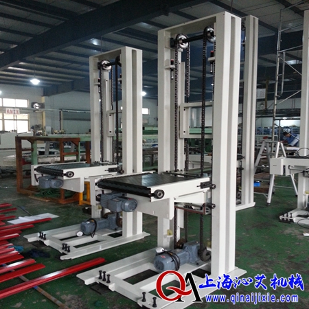紡織制造行業(yè)的生產(chǎn)車間使用的垂直輸送機主要是負(fù)責(zé)輸送絲車、液壓車、紙管車等帶輪子的各類車輛,傳統(tǒng)的垂直輸送機設(shè)計簡陋,只有樓層們,而升級吊籠是開放式的沒有門,無任何保護(hù)措施。原有技術(shù)為了解決此類問題制作了車輛定位條,管狀活動護(hù)欄裝置,在實際使用中也起到了一定的保護(hù)作用。但在提升機上下運行晃動的情況下,車輛會從定位條滑動出來,如果加厚定位條,車輛拉動會很費力;而且當(dāng)各車輛輪子規(guī)格不同時,定位條無法滿足所有要求。管狀活動護(hù)欄重量重,每次升降機運行都要人工安裝和拆卸,操作麻煩,所以仍不斷有事故發(fā)生,經(jīng)常出現(xiàn)車輛滑動跑出吊籠造成卡停及設(shè)備損壞的現(xiàn)象,嚴(yán)重影響了運輸可靠性。