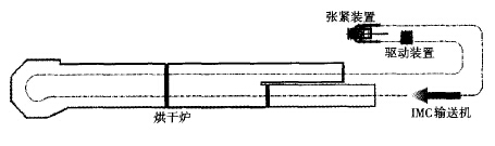 本文中IMC輸送機(jī)與U型烘干爐配合使用。IMC輸送機(jī)的驅(qū)動(dòng)裝置和張緊裝置均布置在U型烘干爐室體外面,僅有軌道和鏈條位于烘干爐室體內(nèi)部,而這兩部分基本不會發(fā)生故障,因此該設(shè)備的維修就顯得極為方便。同時(shí)烘干爐設(shè)計(jì)為橋式結(jié)構(gòu),烘爐的進(jìn)、出口分別設(shè)置成上、下坡,使IMC輸送機(jī)在整個(gè)輸送回路上存在1個(gè)爬坡段和1個(gè)下坡段,這樣整條鏈條在上、下坡段的運(yùn)行阻力和鏈條張緊力之間具有相互均衡的效果,避免輸送電機(jī)出現(xiàn)過載報(bào)警,從而確保U型烘干爐與IMC輸送機(jī)獲得很好的配合使用效果。另外,輸送機(jī)可選用氣動(dòng)張緊方式,氣缸通過定滑輪將鋼絲繩的拉力傳遞至伸縮框架,然后帶動(dòng)預(yù)先設(shè)置在軌道上的伸縮軌道(圖2中張緊裝置處彎軌)調(diào)整鏈條的張緊程度,這樣便可以很好地抵消因烘干爐內(nèi)部高溫造成輸送機(jī)受熱或降溫而引起的軌道和鏈條的伸縮量。